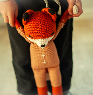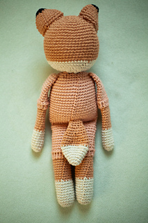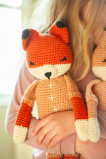 I have used several different cotton blends for this Fox, one of my favorites is “Pima Suprema” from Hobby Lobby (a 4/medium weight) - with which I used a size F hook (this produces a bunny measuring 16 ½” from ear-tip to toe). The Pima Suprema is a 180 yard skein, you will need only one skein of each color (You will use over half of the body color, and around half of the romper color). Just keep in mind when selecting your fiber that it will need to have a decent body to it or your ears will be floppier-which still could be totally cute!