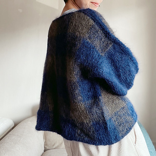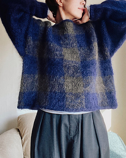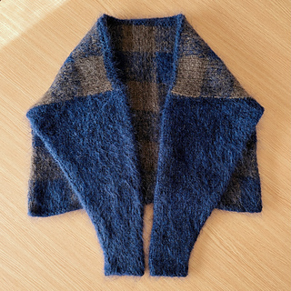 The sample features a two-color gingham check pattern, but it’s also possible to combine multiple colors of your choice to create your own original check pattern. The gingham check pattern on the body requires careful handling of the yarn and a bit of patience, but please enjoy seeing the pattern come together as you finish it. Knitted with two strands of mohair yarn, this sweater becomes a wonderfully fluffy and warm garment.