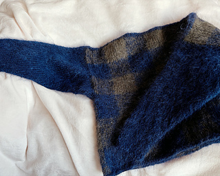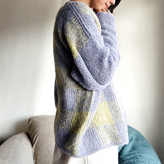Yarn usage for sample made with different yarn: Soft Fine by Isager (63% alpaca, 26% silk, 11% yak, 25 g / 150 m), Size 3, adding 1 check unit to underarm body = MC / 12 Purple 920 m, CC / 35 Yellow 410 m.