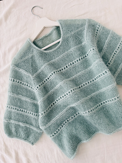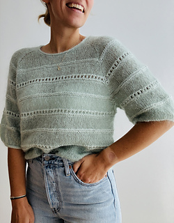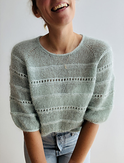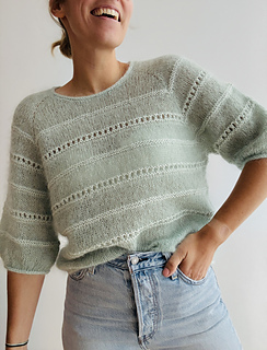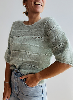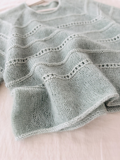 The light blouse is worked in stockinette stitch with lace and a textured pattern in reverse stockinette stitch top down in one piece. First, the yoke is worked in stockinette stitch back and forth in rows, with additional increases along the front panels to shape the round neck. As soon as the round neck is closed to the round, the yoke is shaped with raglan increases only. Additionally, you start working the lace pattern and the textured pattern in reverse stockinette stitch, which is emphasized by using a different yarn combination: The main part of the body and the sleeves is worked with 2 strands of silk mohair (“Edith”) held together, but the lace pattern and the textured pattern in reverse stockinette stitch are worked with 1 strand of lace weight yarn and 1 strand of fingering weight yarn held together (“Edith” together with “Helene”). When the sleeves are separated from the body, the blouse is then finished in the round and the stitches are bound off with an I-cord edging. Then, the resting sleeve stitches are picked up again and the sleeves are finished in stockinette stitch with the lace pattern and the textured pattern in the round. Then, the sleeve stitches are bound off with an I-cord edging to match the bottom hem. The neckline is finished off with an applied I-cord edging as well.