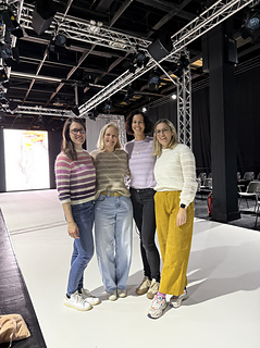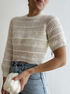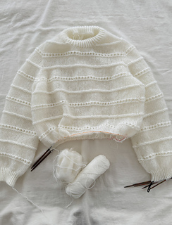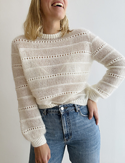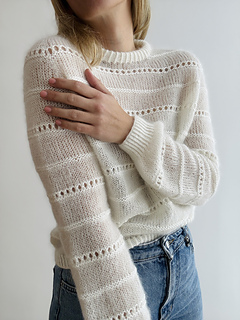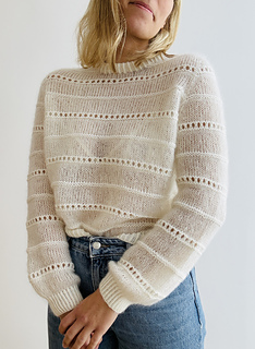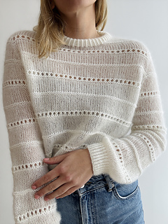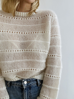 The sweater is worked in stockinette stitch alternated by a beautiful textured lace pattern with raglan increases top down in one piece. First, the body is worked back and forth in rows to shape the round neck. Therefore, increases are worked in right side rows and wrong side rows to shape a saddle shoulder (and the round neck, of course). Then, the sweater is worked in the round with sleeve and round neck increases only. Afterwards, there are classic raglan increases, until the sleeves are separated from the body. The body is then finished in stockinette stitch alternated by the beautiful textured lace pattern in the round and with a hem in 1x1 half twisted ribbing with twisted knit stitches. The sleeve stitches are picked up again and the sleeves are finished in stockinette stitch and in the beautiful textured lace pattern in the round and with cuffs in 1x1 ribbing with twisted knit stitches. Last but not least, stitches around the round neckline are picked up and a double folded collar is worked in 1x1 ribbing with twisted knit stitches. The beautiful textured lace pattern, which covers body and sleeves, is emphasized by using different yarn qualities: 2 strands of Tilia for the stockinette stitch part and 1 strand of Tilia held together with 1 strand of Arwetta for the textured lace pattern. The combination of Tilia and Arwetta is used for the half twisted ribbing of collar, cuffs and hem as well. The fit of the sweater is fitted around the shoulders, but looser around bust and waist. The sleeves are again relatively fitted around the upper arm and flow straight into the ribbed pattern of the cuffs, but straight and without any shaping.