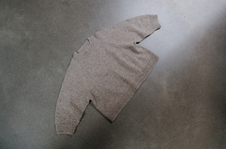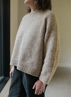 The sample is knit in a size 2 worn with 15” of ease. Knit with Cascade Eco merino Dk in the color Sandy Beach held with Cascade 220 fingering in the color Doeskin Heather.