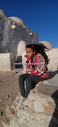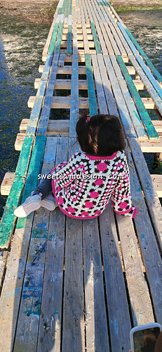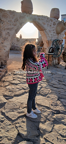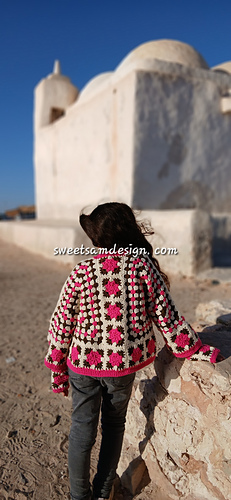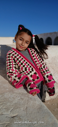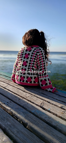 The pattern is built using two crochet hexagons for the body and a series of floral granny squares joined to shape the sleeves, back, and hem. Textured front post double crochet (FPdc) borders add structure and warmth, giving the cardigan a polished yet cozy look.