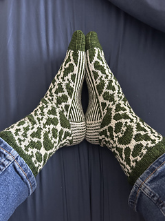 Rorschach River socks are knit cuff down using stranded colour work. Ladder back jacquard stranding for longer sections was used for improved fit. Using a larger needle size, this pattern takes into consideration a tighter gauge during the colour work sections to ensure a good fit as well.