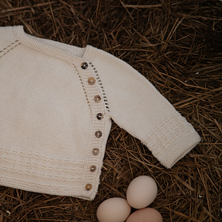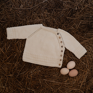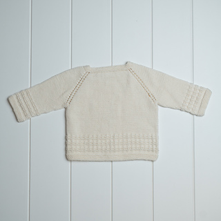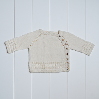 The Rory Wrap Cardigan is knitted back and forth from the top down. It has a textured pattern worked into the lower body and sleeves, and it is closed down the side with buttons. The button band consists of five stitches of garter stitch, and it is worked in one piece with the cardigan. The yoke is shaped with raglan increases and the sleeves are knitted after the body, on double pointed needles in the round.