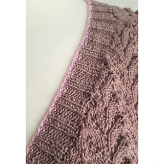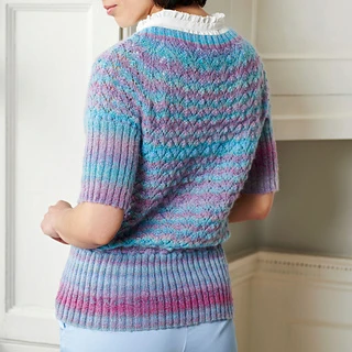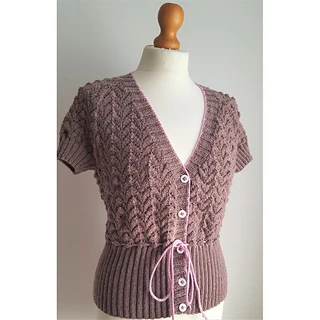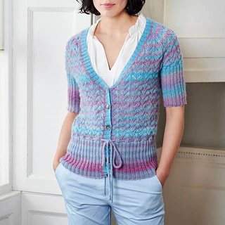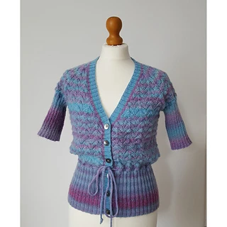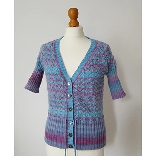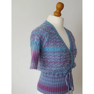 Pretty, short-sleeved lace cardigan knitted using a variegated wool mix yarn.