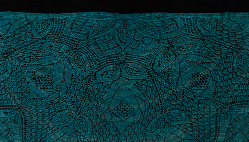 For the design of this shawl, I decided that I wanted to combine two designs by Herbert Niebling to form a semi-circular shawl. The first was from a set of reprints, Kunststricken: Decken, Garnityren, Spitzen originally published by Otto Beyer Publishing House. The pattern in question was from booklet 760 (Herzmuster) and is Fig. 20 on page 12, with the chart appearing as Fig. 7 on the chart sheet. The second pattern was Johannisrose and here is where I ran into problems. While a photograph (page 10) was included in the set of reprints Spitzenstrickerei 1: Historische Muster, it turned out that the pattern chart was not included. Since I did not want to give up on my idea of combining the two patterns, I have done my best to recreate the rose motif from the photograph. Since it did not have sufficient detail to see such things as the placement of decreases, it is hard to tell how accurate the recreation is. I hope Mr. Niebling would not be appalled by my version.