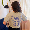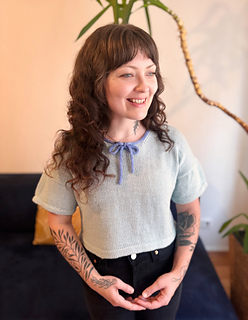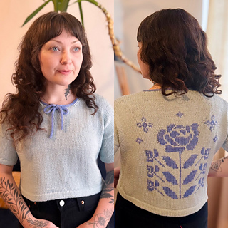 Rose Tee is a boxy, drop-shoulder tshirt with a color work back panel, an i-cord neck detail, and a sweet, dainty bow tying at the center front. Construction is worked in panels from the bottom up, seamed together, with sleeves worked in the round and folded hems.