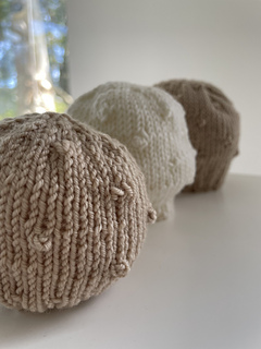 The pattern is in 3 sizes: Full-term Newborn (33cm head circumference), Prem A (28cm) and Prem B (25cm). If knitted in pure wool the hat will stretch as baby’s head grows, to fit longer. Should it be slightly large, the firm band will keep the hat in place, but the band can also be turned back until baby’s head grows, revealing a reverse rib pattern.