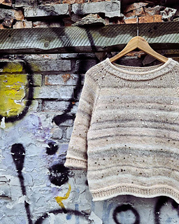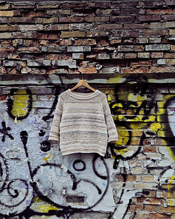 The beige and white blouse in the pictures is knitted in a mix of yarn scraps together with a strand of thin sequin yarn 50 grams = 140 meters. The sequin yarn is knitted in as stripes along the way, 1-2 rounds with sequin yarn and 3-5 rounds without.