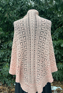 Die Größe des Tuches ist abhängig von dem gewählten Garn. Die Mohair und Sportgewicht Versionen ergeben ein sehr großes Tuch mit folgenden Maßen: 112 cm hoch, gemessen entlang der Mitte, 270 cm Spannweite, gemessen von Spitze zur Spitze.
