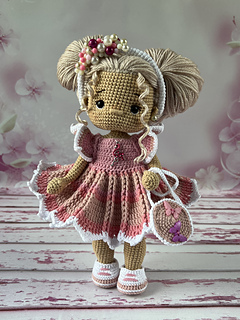 - 4 elements of removable clothing (dress, panties, shoes, hair band with beads), hand bag and a little bunny toy