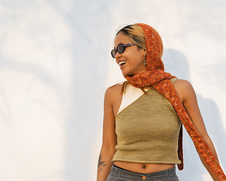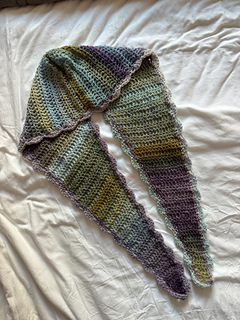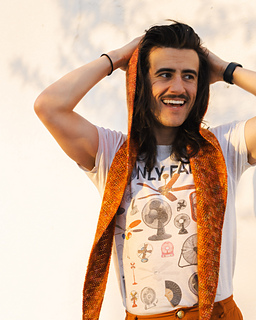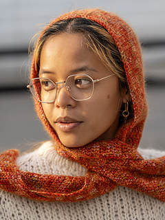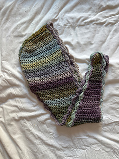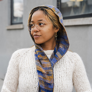 This piece worked up in two panels, each panel starting from the bottom, thin part of the scarf, increasing every other row to eventually make the top/head part of the hood. The hood shape is shaped with normal rows and decrease rows. Both panels are then seamed around the hood section. Once connected, the last part is putting a border edge of choice.