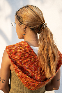 The red/yellow Rosie Hood size S/M is crocheted in Marla by Manos Del Uruguay in the color Chili K100, held double with Aerial by Berroco in the color copper 3433