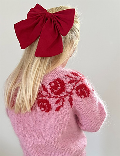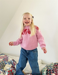 Rosie Yoke Sweater junior is worked from the top down, with the rose border knitted into the circular yoke. The rest of the sweater is kept simple, worked in stockinette stitch with ribbed edges.