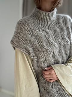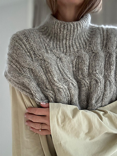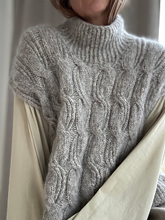 Kroppen strikkes med snoninger og paneler i drejet ret-rib langs siderne. Mod slutningen deles arbejdet igen, og den sidste del strikkes frem og tilbage for at danne slidser i siderne. Bag- og forstykket afsluttes med kanter i drejet ret-rib og italiensk aflukning. Masker samles op langs halsudskæringen, og halsen strikkes ligeledes i drejet ret-rib og afsluttes med italiensk aflukning.