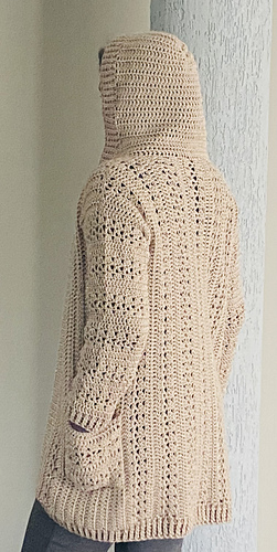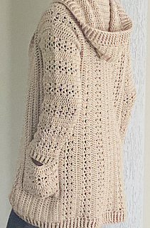 This crochet cardigan can be made with or without the rounded hoodie/ pockets to the required length