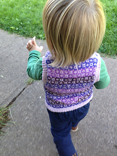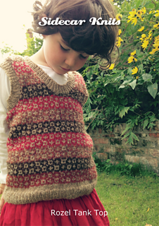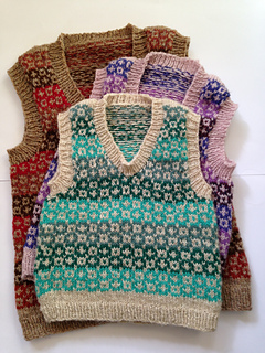 The tank top (vest) is knitted in the round to the armholes, then front and back are knitted flat in rows. The shoulders are gently shaped with short rows, and front and back are grafted together for a seamless finish. The tank top (vest) is completed with ribbing around armholes and neckline.