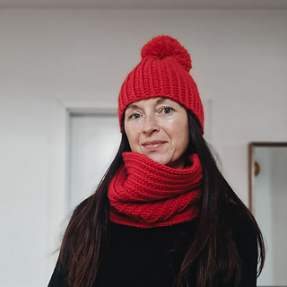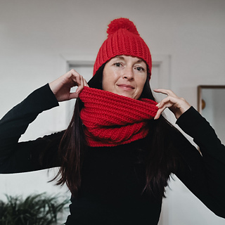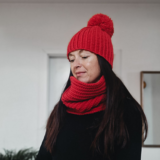 The scarf sits in a single loop around your neck—no wrapping needed. The beanie is worked flat then seamed into a tube, finished with an optional pom pom. Quick to make with medium weight wool, perfect for gift-giving or keeping yourself cozy.