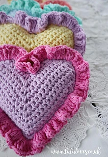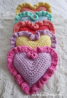 Finished hearts measure approx. 17cm/6.5” (across widest part) x 14cm/5.5” (through the centre) including ruffles (using suggested yarn and hook)