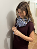 The Rosie Scarf is one large knitting piece, ruffled with a string. At the ends of the string are pompoms.