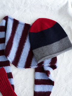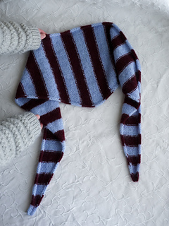 The Ruke Weekend Headscarf knitting pattern. The name says it all - you can knit this little beauty in just one weekend. If you need something quick, sweet and effortlessly cool to refresh your wardrobe, grab your needles and knit the Ruke Weekend Headscarf in a single weekend. The scarf is worked back and forth in rows along the long edge. Both edges are finished with an elegant I-cord edge, giving the piece a clean and polished look. The shaping is created using RLI increases and later balanced with k2togR decreases, forming a beautiful triangular silhouette. The entire scarf is shown worked in stripes, but it can just as easily be knitted in one colour or in as many colours as you like. The pattern includes three sizes. The length remains the same for all sizes - only the width of the triangle changes.