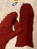 The thumb gusset is knitted on the side, the palms are stockinette sttch, and the backs are a peacock stitch. The bottom hem is a turned picot edge. These mittens can be knit in a variety of yarns.