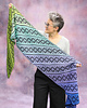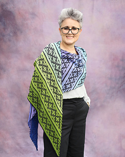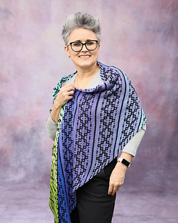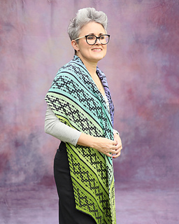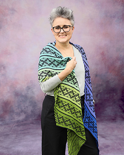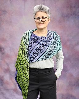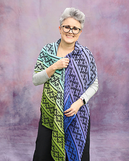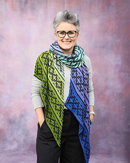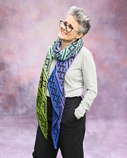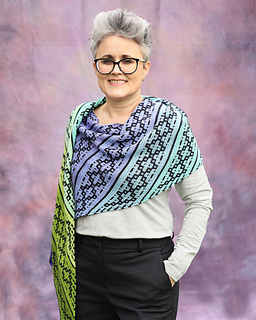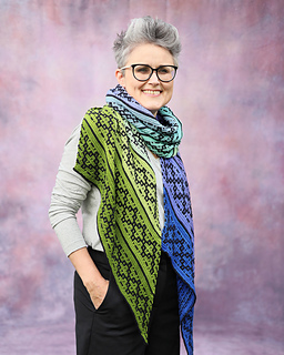 Runelight pattern is designed for two contrasting colors or a luminous gradient set. You can use any number of colors. The sample shown uses one full skein for the main dark color and twelve bright mini skeins for the contrast color. The size is fully adjustable, so you can create a smaller scarf or a sweeping wrap by adding or reducing repeats. Worked with one color per row, the pattern includes both written instructions and charts.