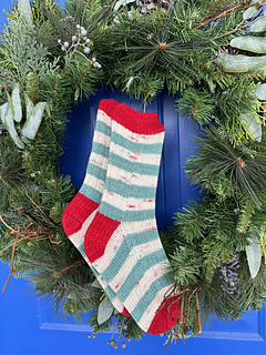 All over stripe version knit size 3 with Emma’s Yarns Practically Perfect Halves. CC is ‘Stiletto’ 19g, MC1 is ‘Christmas Sprinkles’ 28g and MC2 is ‘Sea Me Now’ 24g.