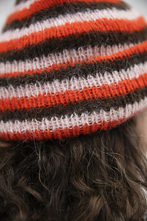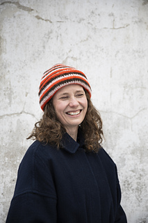 This striped beanie is knitted in two layers as one piece, worked in the round from crown to crown. After that, the layers are placed inside each other and joined together at the crown. 1 x 1 ribbing is worked across the whole knit. Lastly, the brim is folded double.