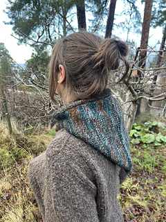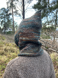 Hetten strikkes ovenfra og ned, fram og tilbake, deretter rundt i glattstrikk.