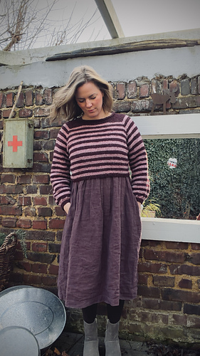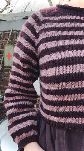The Rustic Stripe Sweater begins with a rolled neckline, followed by short rows that are worked simultaneously with the raglan increases to shape the yoke. After separating the sleeves, the body is worked in the round to just above the waist, where a classic one-by-one ribbing finishes the hem. The sleeves have a subtle balloon shape. The entire sweater is worked in a striped pattern.