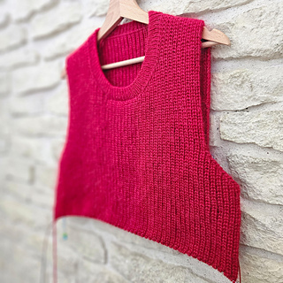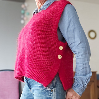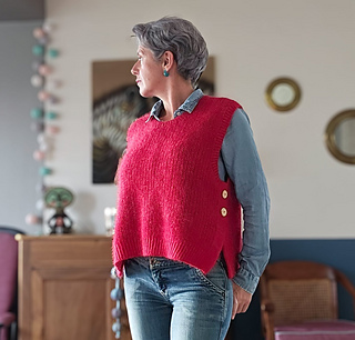 Sacha is a loose and comfortable slipover, worked in broken rib for a beautifully cozy texture. Its boxy shape, deep armholes, and side slits give it a modern, relaxed look. The faux button bands on the sides, each adorned with two buttons, add an elegant and original touch. A model that is easy to wear and simple to knit.