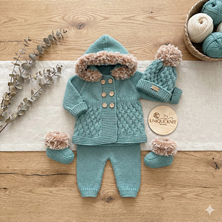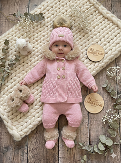 A cosy 4 piece set, perfect for winter. With the option to make a 3/4 length jacket or longer coat with fur hood. The double-breasted Jacket/Coat is knitted flat from the top down on straight needles, so requires minimal sewing. You also have the option to make shorts or longer trousers which are knitted in a similar way so minimal sewing is required and fewer seams, making the outfit comfier for the baby. The booties and bobble hat complete the outfit and knit up quickly