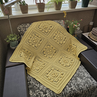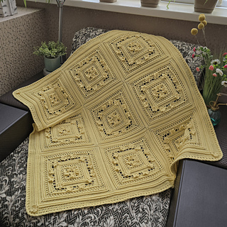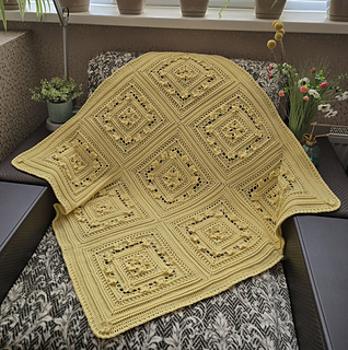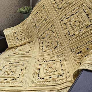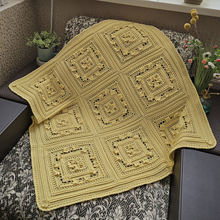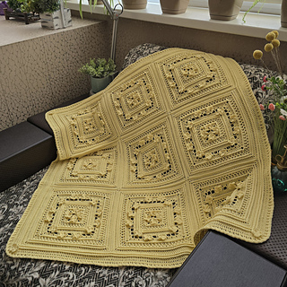The blanket is crochet from individual square motifs.