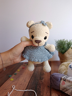 Crochet your own little Sally the Bear. This pattern is intermediate, but if you have basic skills in amigurumi, you would be able to make this. This pattern does contain Double Crochet, Half Double Crochet stitches, working in rounds and rows.
