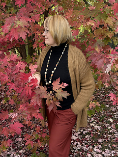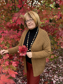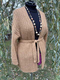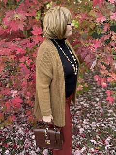 2 yarns are knitted together making almost Sport weight yarn. The gauge for front and back/sleeves patterns is different, so different number of stitches and rows are knitted for the back and front.