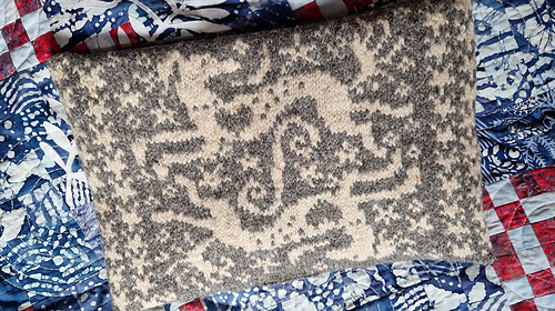 This is a cushion cover which is worked in Aran weight yarn on large needles so it can be completed quite quickly. I was inspired to design it after watching the wild antics of Bear, my Saluki x Greyhound. The instructions are to make a small 12” x 12” cushion, but the chart could easily be used for a bag, or made larger or smaller by addition of stitches or using larger/smaller needles.