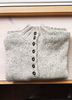 Once the front and back meet, the body comes together on a circular needle and flows effortlessly in the round. Stitches are picked up for the sleeves, which are also worked in the round, and everything is finished with crisp 2x2 ribbing using a smaller needle for a clean, defined edge. A double button band with buttonholes adds a touch of detail and makes styling a breeze.