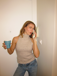 En tettsittende strikket topp med rene linjer og en høy, dobbelt brettet halskant. Toppen strikkes ovenfra og ned med formede skuldre, diskrete innfellinger i midjen og en pen avslutning i halsen.