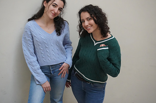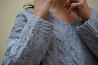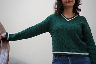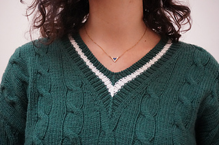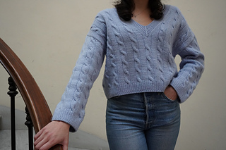 The Sandro Pullover V-neck is worked from the top down with a drop shoulder construction. You start by casting on the back and shaping it with short rows for a better fit. Work the back yoke until it reaches the underarms. After this, each shoulder is worked back and forth and shaped with short row shaping. Then you increase for the v neckline until you are ready to join everything in the round. The sleeves are worked from stitches that are picked up and knit along the armhole edge and they are shaped using short rows. The neck edge is worked up in ribbing with stitches picked up along the neckline. There are two options in the pattern: one for a thin neckband or for a thick neckband, there are also instructions to add contrast colour stripes.
