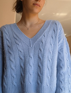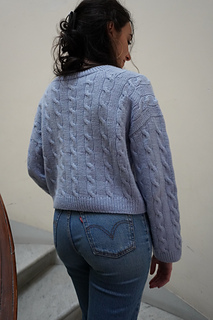 The blue sample is knitted in Drops daisy in the shade “light blue”, the model in the photo is wearing a size 3 and has a bust circumference of 90 cm 35 ½ inches and is about 173 cm 5’ 8” tall.