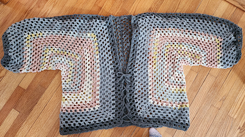 Cardigan worked in sections: Hexagon Motif (rounds), Back (rows), Seams (Sew), Border (rounds).