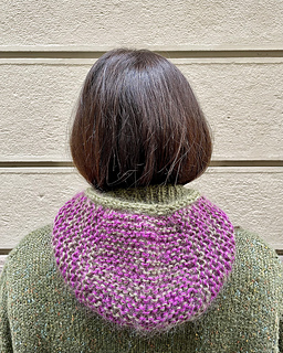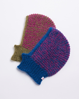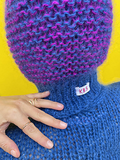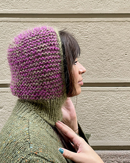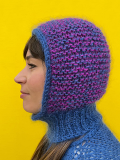 Soft, voluminous and colorful this balaclava is worked top-down in garter stitch with a 1x1 ribbed neck and an I-cord finishing edge.