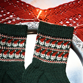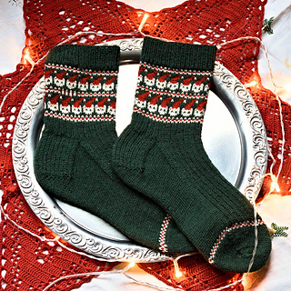 For years now, my Christmas pattern has been a fun tradition. This year has been a hard one with the loss of our beloved cat Solveig, so cats have been on my mind a lot. When it got to the time of designing these socks, I needed easy comfort knitting with short floats, so I turned to my Kitty Cuff design. Why not stick a fun hat on those cats and make them festive? The foot has added ribbing for a snug fit and easy, but engaging knitting that can be done during this busy season and while in company.