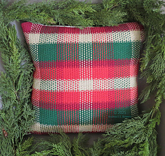 The front panel of this pillow cover is worked in reverse stockinette stitch. The tartan effect is achieved by weaving strands of yarn vertically through alternating purl bumps. The pillow cover’s woven fabric back panels are machine-sewn (or hand-sewn) and have a simple envelope-style opening.