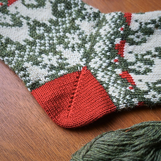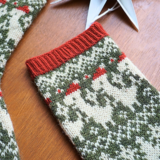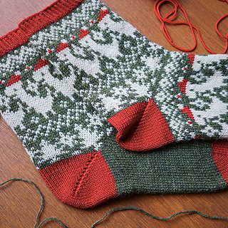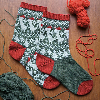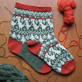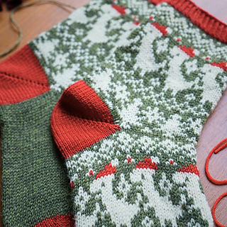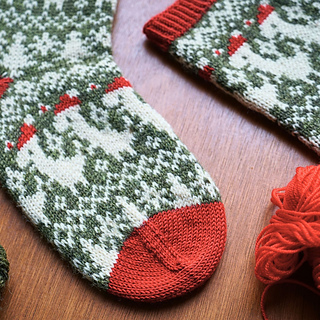 Worked in the round from the cuff down, these socks combine traditional fair isle style with a whimsical modern motif. The stranded colourwork creates a warm, snuggly fabric, ideal for chilly winter days, while the repeating Santasaurus pattern around the leg keeps the knitting entertaining from start to finish.