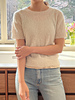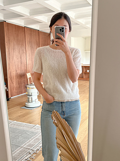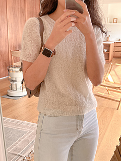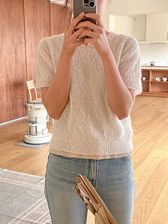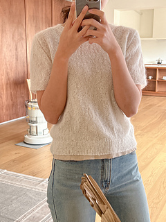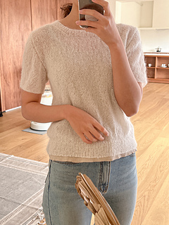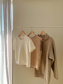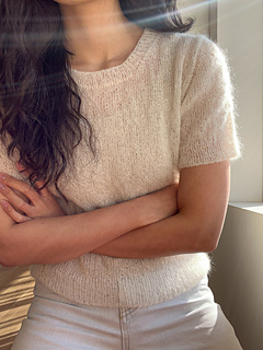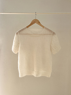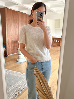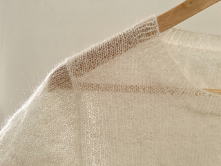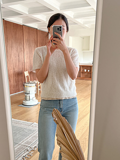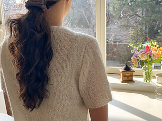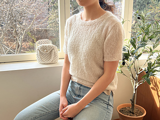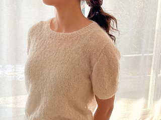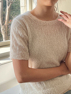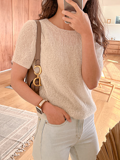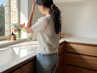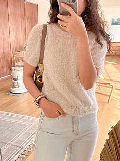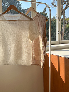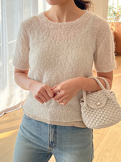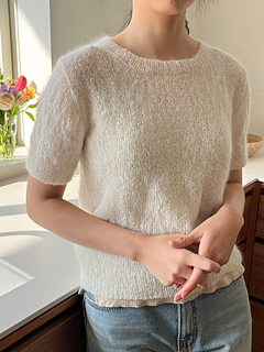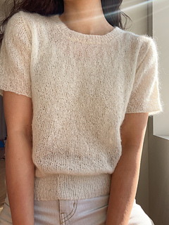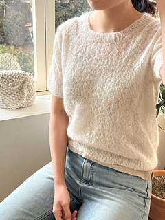 A short-sleeve mohair top worked in a single strand, made top-down. The design features a high sleeve cap and a shoulder line that doesn’t drop, giving a structured fit. Worked in a thin mohair strand, it is slightly see-through, so we recommend layering with an inner top. Its breathability makes it wearable in summer, and it pairs well with a thin long-sleeve turtleneck for transitional seasons. Anyone who has worked a top-down vest can tackle this pattern without difficulty, and tip videos are provided for the trickier sections.
