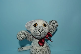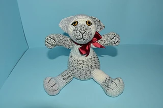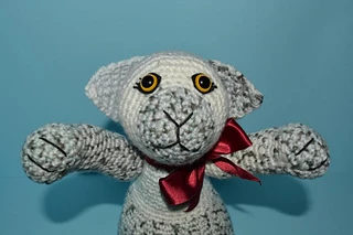 Materials needed: 2.5mm crochet hook, 100g or 3.5 oz of Elle Escapade Double Knit Yarn in colour Farrago (373), black embroidery thread,12mm yellow safety eyes, small piece of black felt, 50cm or 20 inches of 2.5cm or 1 inch wide maroon satin ribbon, and stuffing