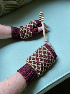 Scalasaig (pronounced skuh-LASS-ig) is the main settlement on the isle of Colonsay. The island is famous for its native black bees and the honey they produce, so a fitting name for a colorwork pattern that looks like honeycomb. These mitts are worked in Tunisian crochet in the round with straight Tunisian crochet used for the ribbing.